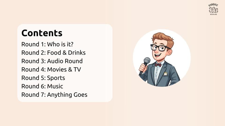 Na betaling ontvang je een compleet quizpakket waarmee je direct aan de slag kunt. Je krijgt de PubQuiz in PowerPoint en PDF, inclusief scoreformulier, antwoordformulier en een professioneel opgemaakte quiz. Ook vind je in de quiz zelf duidelijke instructies voor het spelen.