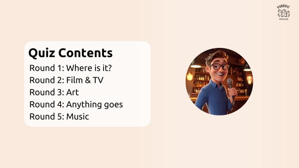 Na betaling ontvang je een compleet quizpakket waarmee je direct aan de slag kunt. Je krijgt de PubQuiz in PowerPoint en PDF, inclusief scoreformulier, antwoordformulier en een professioneel opgemaakte quiz. Ook vind je in de quiz zelf duidelijke instructies voor het spelen.