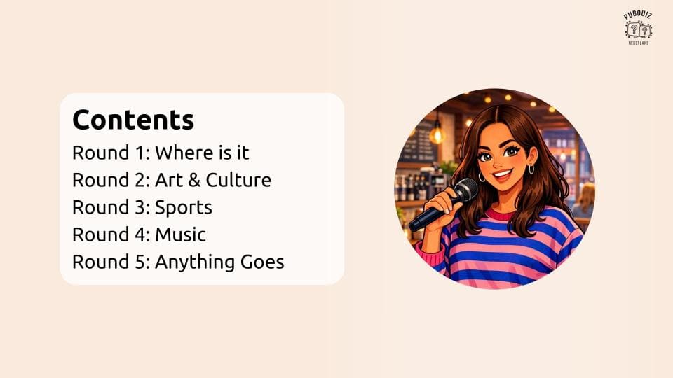 Na betaling ontvang je een compleet quizpakket waarmee je direct aan de slag kunt. Je krijgt de PubQuiz in PowerPoint en PDF, inclusief scoreformulier, antwoordformulier en een professioneel opgemaakte quiz. Ook vind je in de quiz zelf duidelijke instructies voor het spelen.