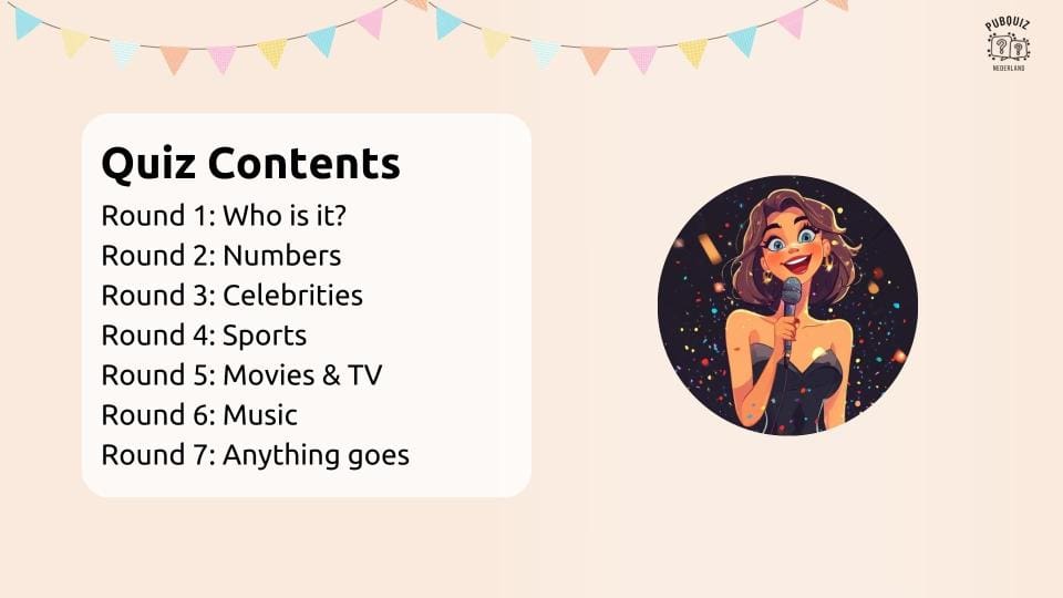 Na betaling ontvang je een compleet quizpakket waarmee je direct aan de slag kunt. Je krijgt de PubQuiz in PowerPoint en PDF, inclusief scoreformulier, antwoordformulier en een professioneel opgemaakte quiz. Ook vind je in de quiz zelf duidelijke instructies voor het spelen.