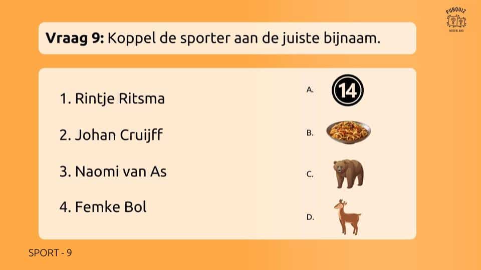 Je hebt een apparaat nodig om de quiz op af te spelen, zoals een laptop of pc. Voor grotere groepen kun je de quiz eenvoudig tonen op een tv, groot scherm of beamer. Verder heb je alleen pen en papier nodig — en natuurlijk een gezellige groep om mee te spelen!